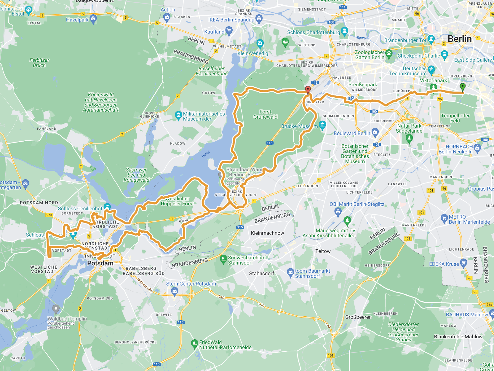 Daher bietet diese Tour euch sowohl Naturerlebnisse als auch viele Sehenswürdigkeiten. Wir fahren in Berlin immer am Wasser entlang, dann über die Havelchaussee durch den Grunewald, der Havel entlang und um den Wannsee herum nach Potsdam.